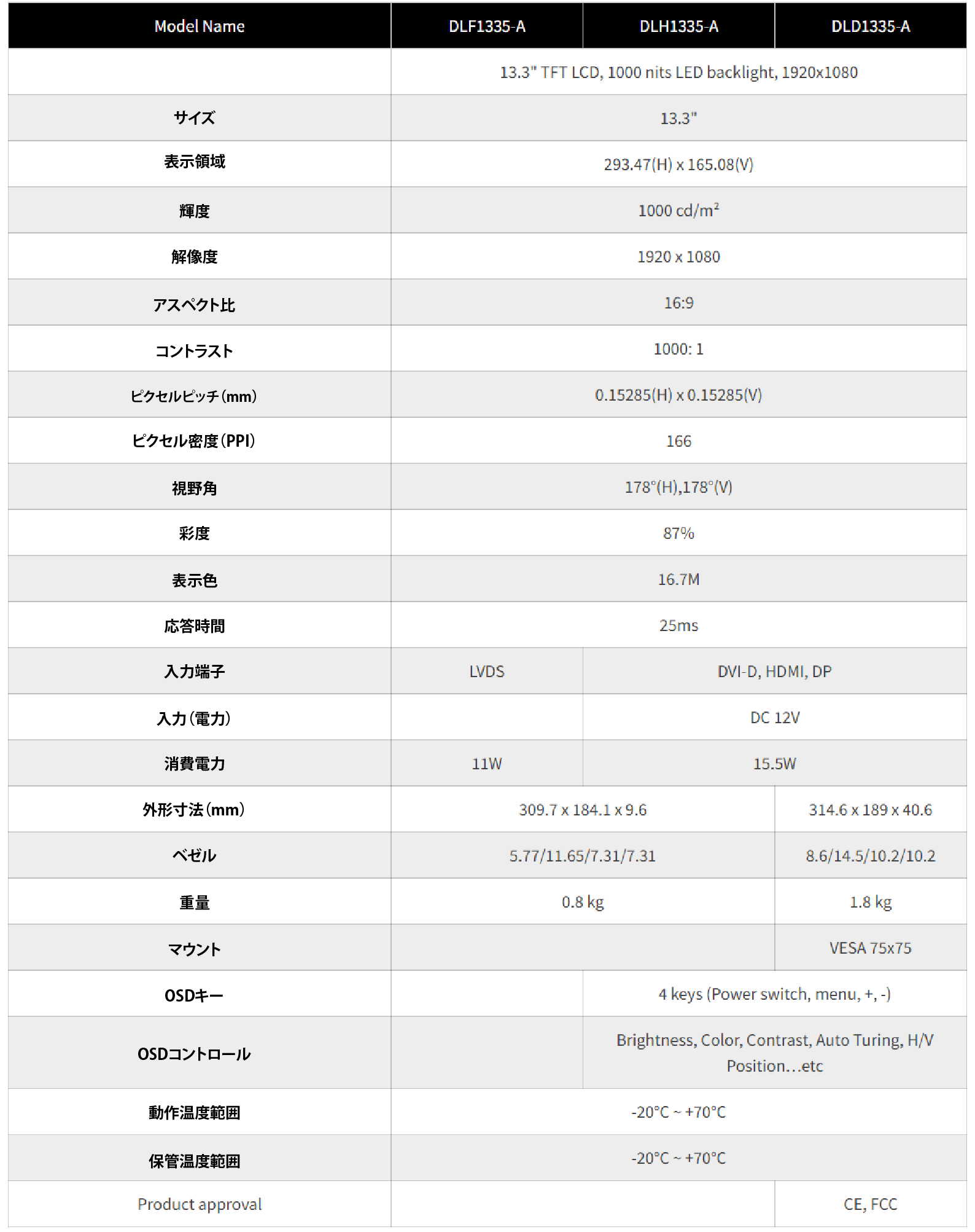 DLD1335-Aは13.3インチ1000nitsの高輝度液晶ディスプレイです。 高彩度、シャープな画像、鮮明な文字、生き生きとした色を再現します。屋外のアプリケーション、キオスク、ファクトリーオートメーション、 軍事、輸送、ゲームなどのアプリケーションに最適です。