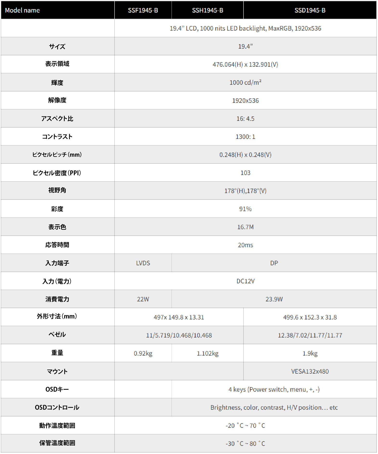 高輝度広視野角の19.4インチ高輝度ウルトラワイド液晶ディスプレイ