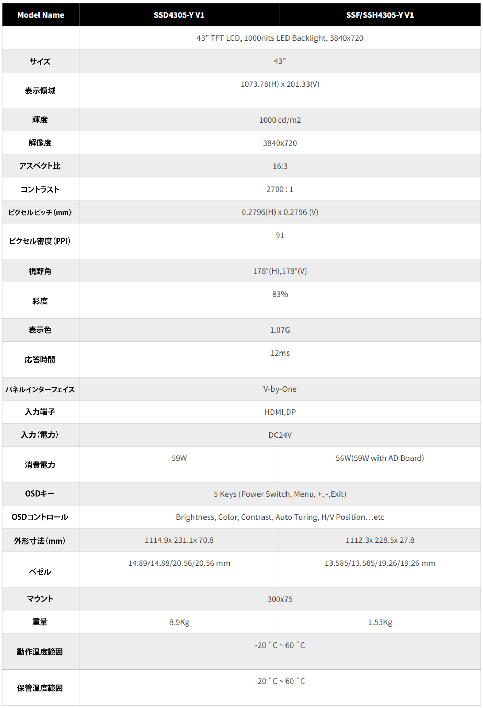 43インチ、1000nits、解像度3840x720のウルトラワイド液晶ディスプレイ。