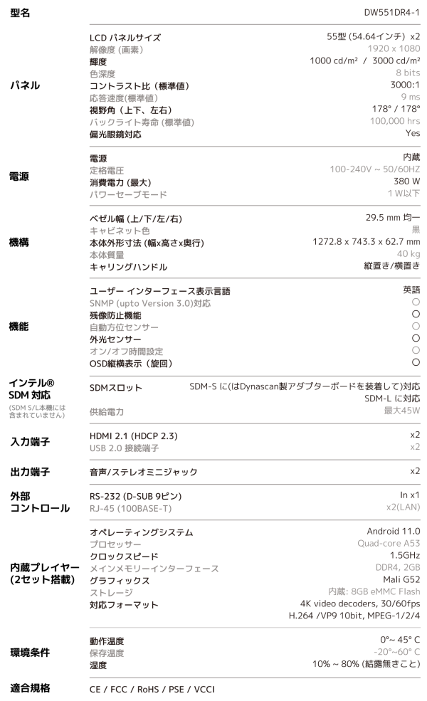 Dynascan製品ラインナップ ・両面ディスプレイ1000 / 3000 cd/m² ・縦 / 横向き設置対応 ・天吊り設置 ・床置き設置 ・美しい自然な色