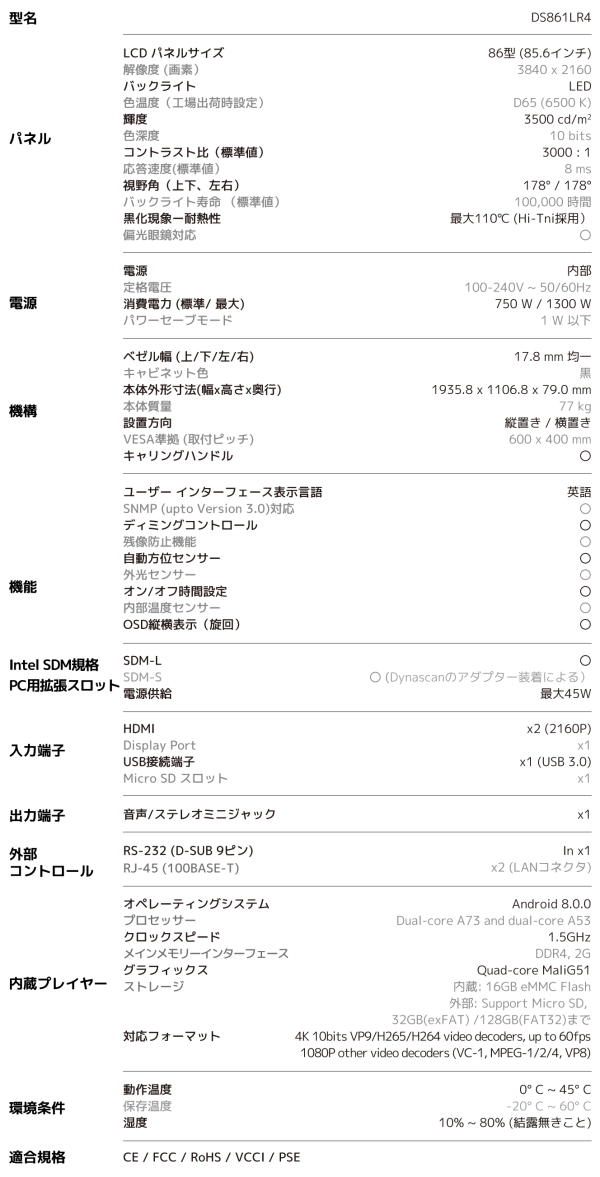 Dynascan製品ラインナップ ・超高輝度3500cd/m2で明るい環境でもよく見える ・ディミングコントロール ・4K UHD大画面高精細映像 ・美しい自然な色