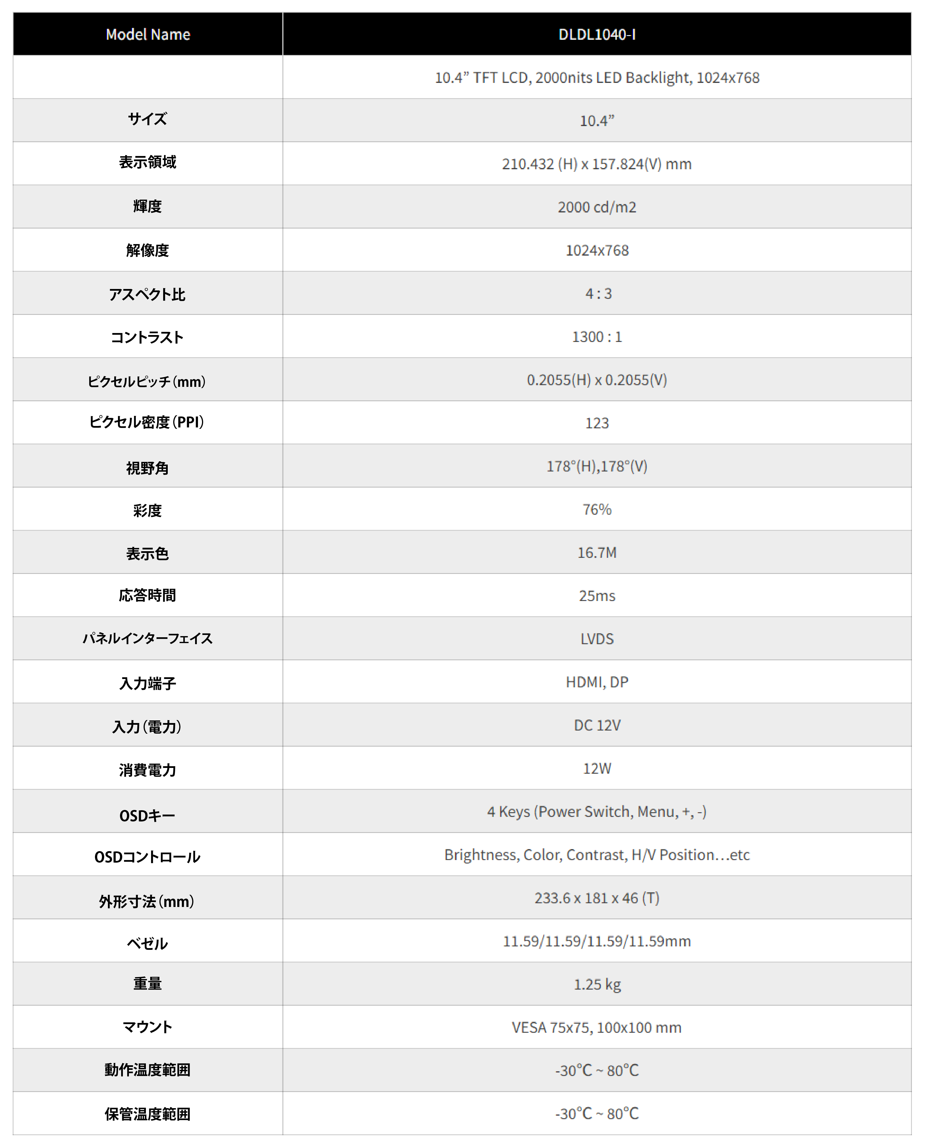 DLD1040-Iは10.4インチ産業用グレードの太陽光下可読液晶ディスプレイです。 高輝度2000cd/㎡により、鮮明な画像、くっきりとした文字、リアルな色再現を実現します。 Durapixel LEDバックライト技術により高い信頼性と低消費電力を確保し、屋外アプリケーション、キオスク、輸送、ゲーム用途に適しています。